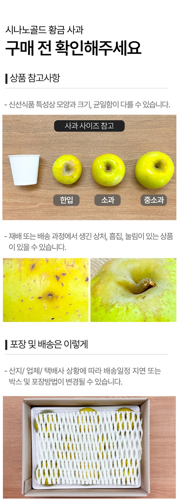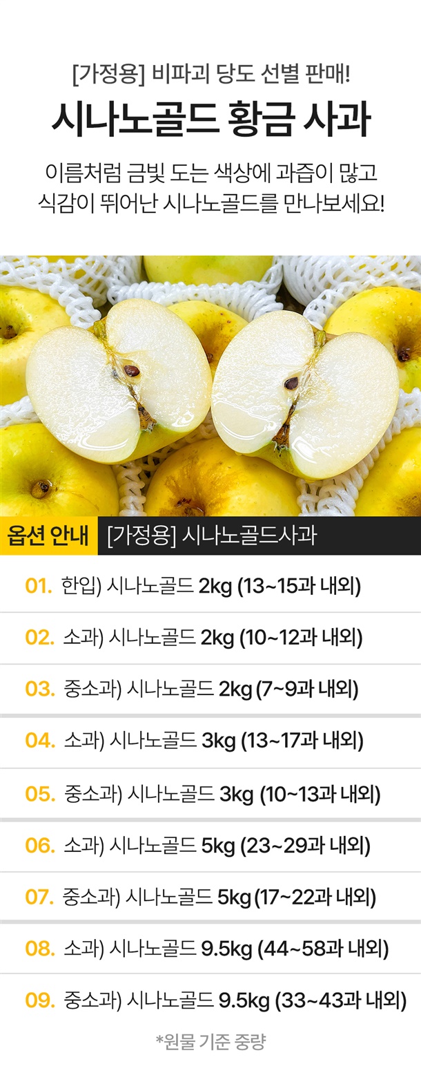 2kg(한입 13~15과 내외 / 소과 10~12과 내외 / 중소과 7~9과 내외), 3kg(소과 13~17과 내외, / 중소과 10~13과 내외), 5kg(소과 23~29과 내외, / 중소과 17~22과 내외), 9.5kg(소과 44~58과 내외, / 중소과 33~43과 내외) |