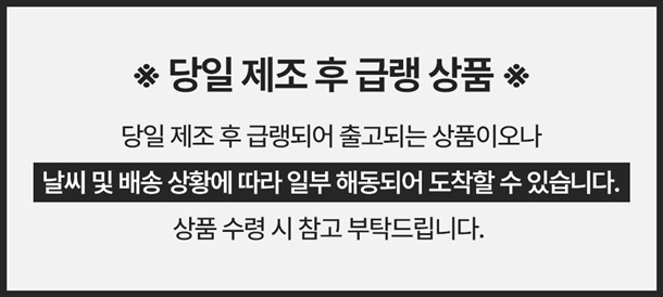 ㆍ땅콩, 호두, 콩, 견과류 등을 사용한 제품과 같은 제조시설에서 제조하고 있습니다. ㆍ받으시면 바로 드실 것을 권장합니다. (보관은 냉동 보관) ㆍ멥쌀로 만드는 떡이니 간혹 배송 과정에서 굳을 수도 있습니다. 떡 생산 과정에서 첨가물을 넣지 않기 때문에 자연 해동이 되지 않을 수 있습니다. ㆍ냉동 상태 또는 자연해동이 되지 않는 떡은 봉지채 전자레인지에 돌리시면 말랑하게 드시기 좋습니다. (찜기, 전기 밥솥 사용 가능) ㆍ해동 후 다시 냉동하지 마시길 바랍니다.