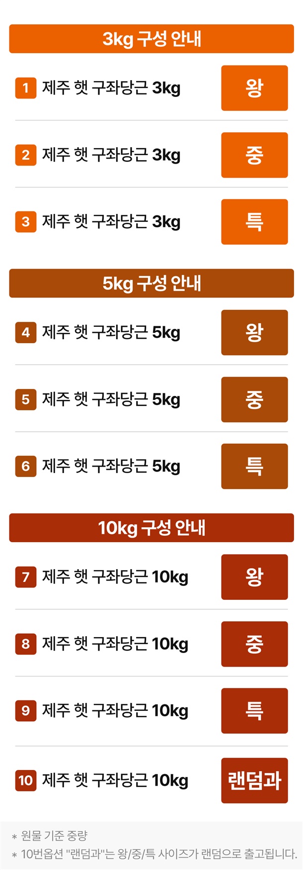 3kg (왕 / 중 / 특 ), 5kg(왕 / 중 / 특 ) , 10kg (왕 / 중 / 특 /랜덤과) |