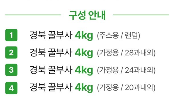 ㆍ주스용(랜덤과) 4kg ㆍ가정용(28과내외/24과내외/20과내외) 4kg |