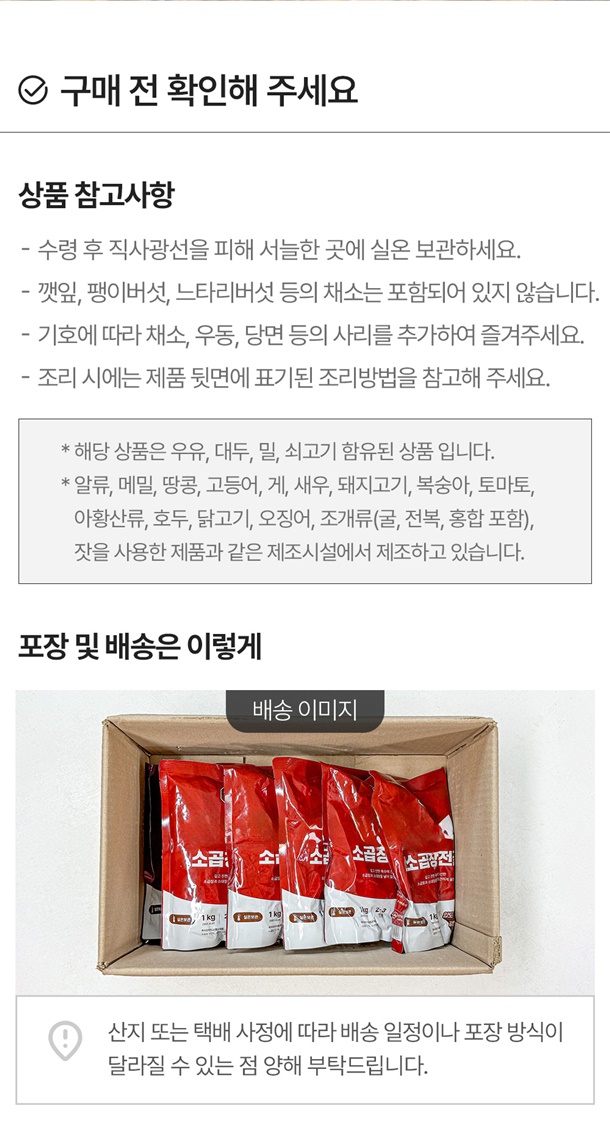 ㆍ조리시 자리를 뜨지 마시고 조리과정을 확인하십시오. ㆍ끓는 물에 중탕 조리시 뜨거운 물이 튈 수 있으니 주의하십시오. ㆍ끓는 물에 중탕 시 봉지가 터질 우려가 있으니 냄비뚜껑을 덮지 마십시오. ㆍ제품 개봉시 손을 다칠 위험이 있으니 주의하십시오. ㆍ개봉한 제품은 변질의 우려가 있으니, 반드시 냉장보관 하시고 가급적 빨리 드십시오. ㆍ본 제품은 알류, 메밀, 땅콩, 고등어, 게, 새우, 돼지고기, 복숭아, 토마토, 아황산류, 호두, 닭고기, 오징어, 조개류(굴,전복,홍합 포함), 잣을 사용한 제품과 같은 제조시설에서 제조하고 있습니다.