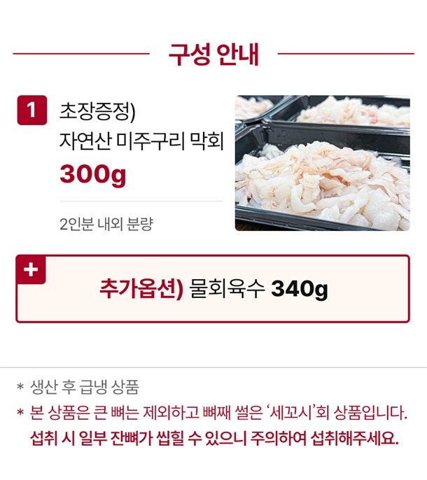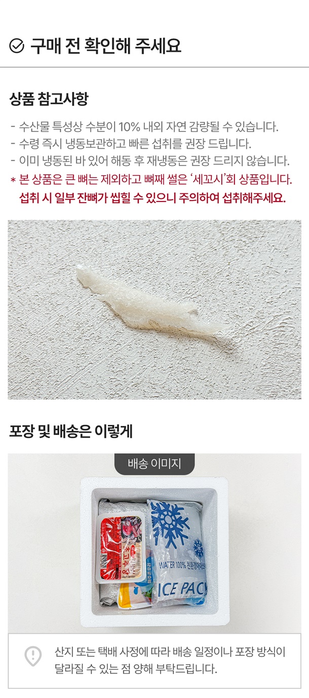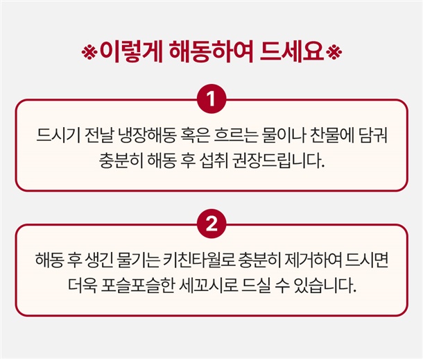 | 1. 소비자안전을 위한 주의사항 | 수령 즉시 냉동보관 부탁드리며, 이미 냉동된 바 있으니 해동 후 재냉동은 권장드리지 않습니다. |