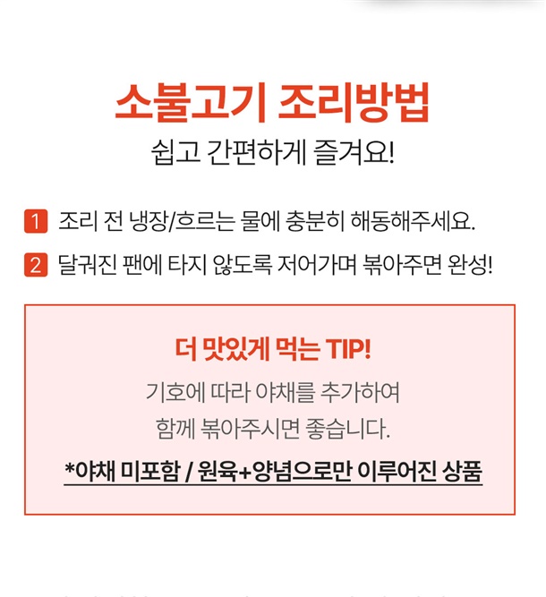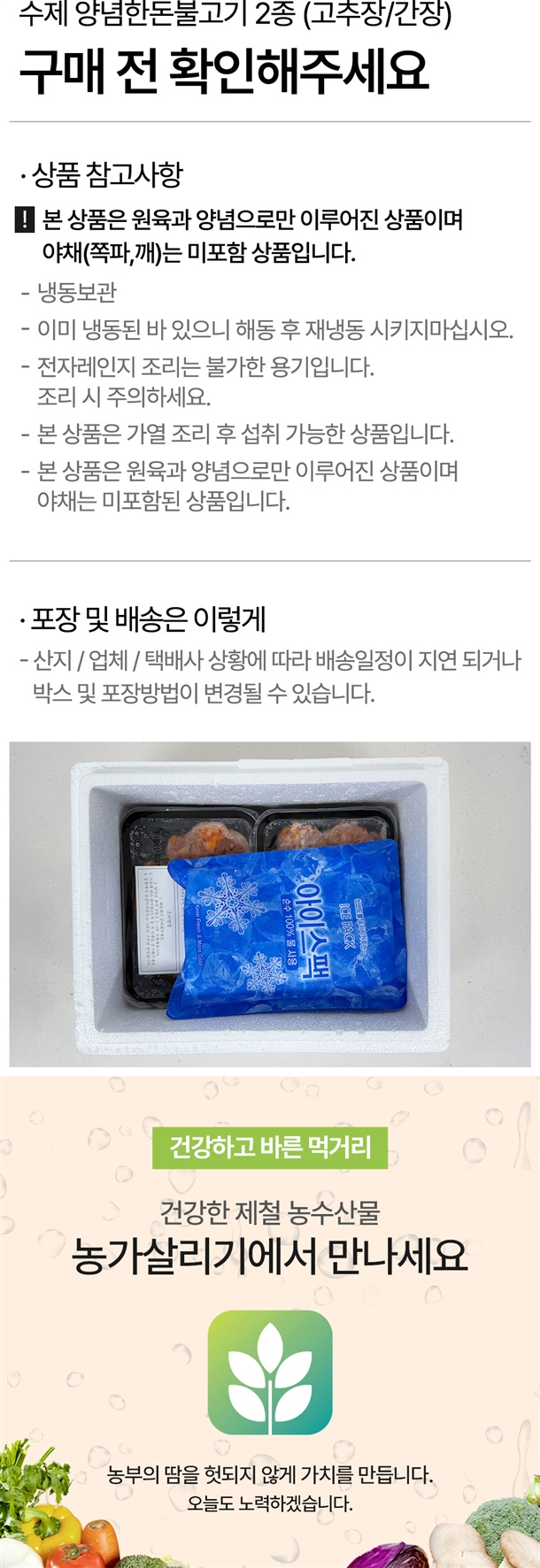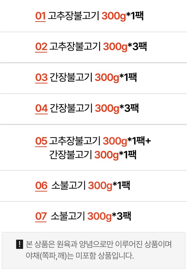 | 상품구성 및 내용량 | 고추장불고기(300g*1) / 고추장불고기(300g*3) / 간장불고기(300g*1) / 간장불고기(300g*3) / 고추장불고기(300g*1)+간장불고기(300g*1) / 소불고기(300g*1) / 소불고기(300g*3) |