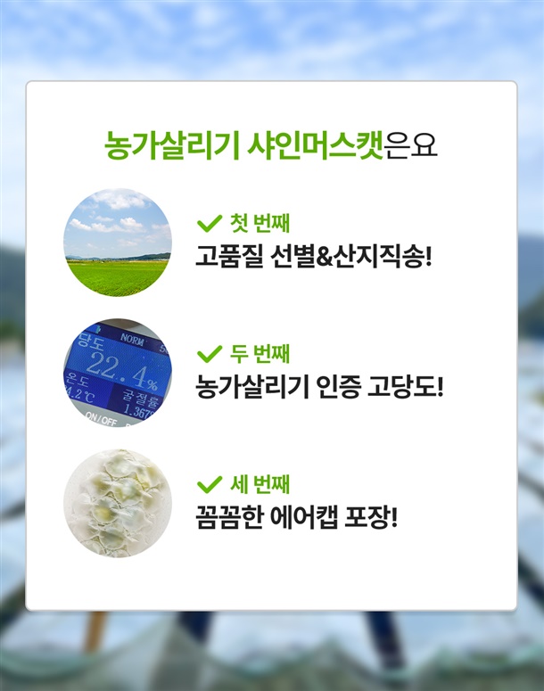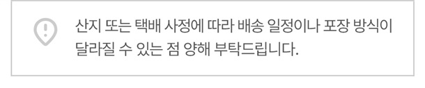- 배송일 지정은 불가하며 산지에서 순차적으로 출고됩니다. 배송 메시지는 배송 시 택배기사에게 전달되는 사항으로 날짜가 기재 되어있어도 지정일 배송이 어렵습니다.