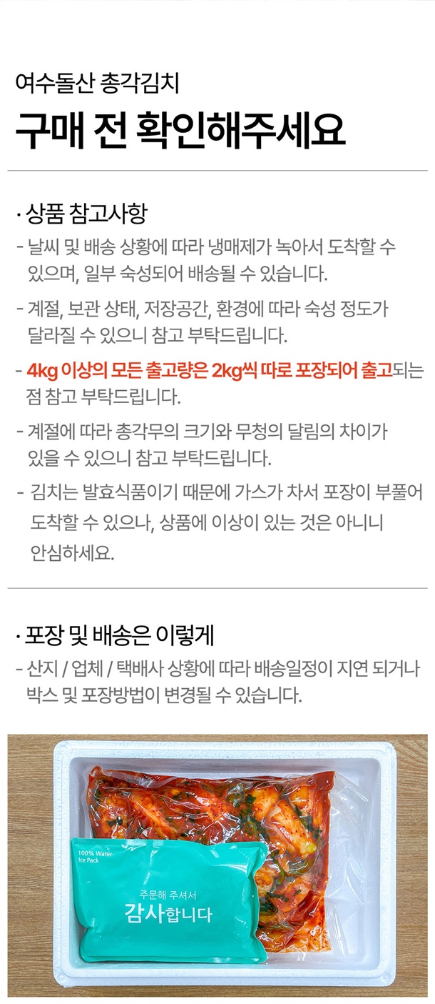 절임총각무67.3%(총각무95%:국내산,식염5%:국내산), 절임열무7.7%(열무95%:국내산,식염5%:국내산), 고춧가루11%(국내산), 건고추4%(국내산), 까나리액젓3%(까나리65%:국내산,잡어10%,식염25%:국내산), 식염(국내산), 양파(국내산), 무(국내산), 다시마, 디포리(국내산), 대파(국내산), 찹쌀(국내산), 새우젓(국내산), 마늘(국내산), 설탕, 생강(국내산) [새우 함유] |