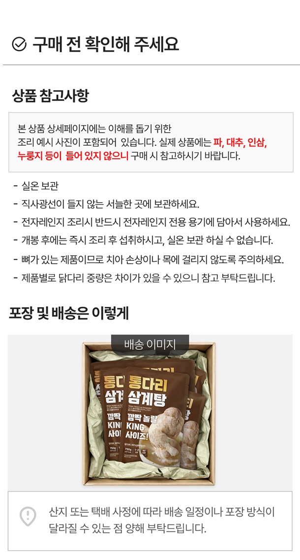 ㆍ이 제품은 대두, 밀, 새우, 조개류, 쇠고기, 돼지고기, 닭고기, 복숭아, 난류, 게, 오징어, 고등어, 우유, 땅콩, 호두, 잣, 토마토, 메밀, 아황산류를 사용한 제품과 같은 제조시설에서 제조하고 있습니다. ㆍ잔뼈가 있을 수 있으니 섭취시 유의하시기 바랍니다. ㆍ충분히 가열 후 섭취해 주세요. ㆍ고기가 붉은색을 띌 수 있으나, 이는 근육단백질 성분이며 100˚C이상 고온조리된 제품이니 안심하고 드셔도 됩니다.* 본 제품은 공정거래위원회 고시 소비자 분쟁해결기준에 의거 교환 또는 환불해드립니다. * 부정·불량식품 신고는 국번없이 1399