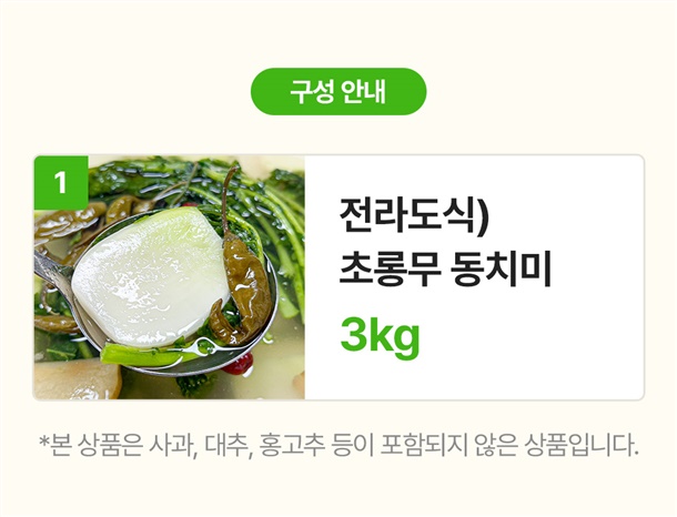 정제수50%, 초롱무(국내산)30%, 염장새우(베트남산)2%, 마늘(국내산)2%, 생강(국내산)2%, 양파(국내산)2%, 액젓2%, 백설탕2%, 갓(국내산)2%, 밀가루2%, 천일염(호주산)1%, 청양고추(국내산)1%, 배(국내산)1%, 절임무청(국내산)1% |