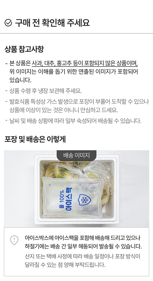 - 재판매가 불가한 신선식품 특성상 상품 하자 외의 단순변심(맛, 향, 식감 등)으로 인한 교환 및 반품이 불가합니다.