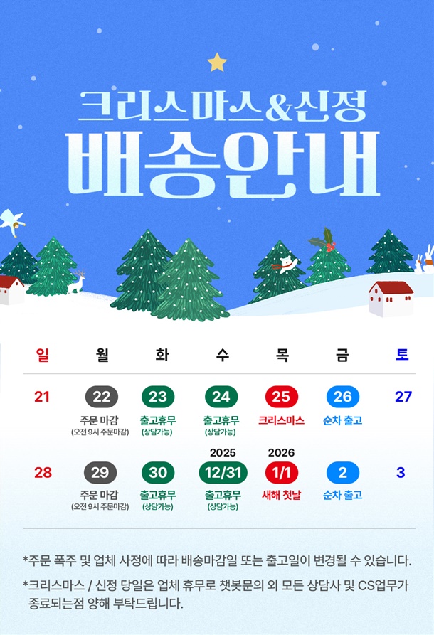 - 배송일은 결제 다음 날부터 평일 기준 2~4일 정도 소요됩니다. 주문 폭주나 산지, 택배 상황에 따라 추가로 지연될 수 잇습니다.