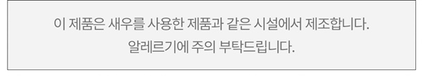 | 소비자안전을 위한 주의사항 | ㆍ이 제품은 새우를 사용한 제품과 같은 시설에서 제조합니다. ㆍ본 제품은 공정거래위원회 고시 소비자 분쟁해결기준에 의거 보상받으실 수 있습니다. ㆍ부정불량 식품신고 국번없이 1399 |