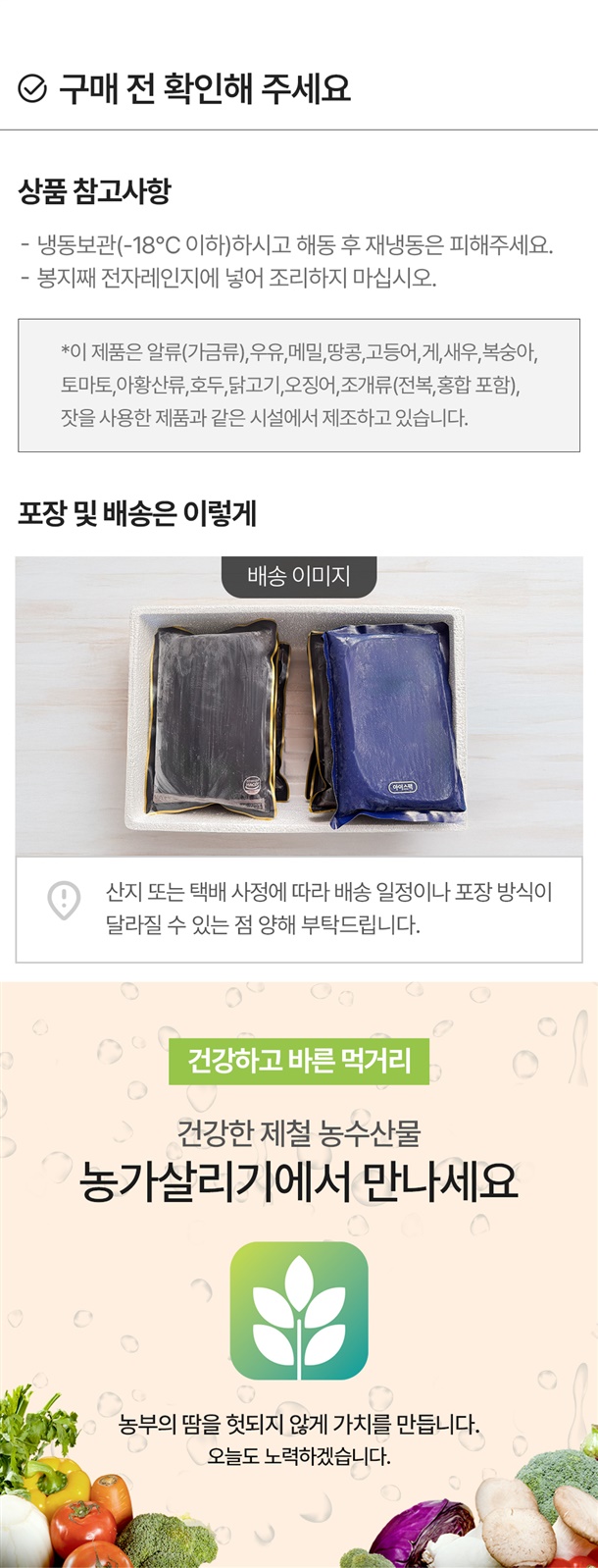 ㆍ사용 후 포장재는 분리배출하여 주십시오. ㆍ이미 냉동된 바 있으니 해동 후 재냉동 시키지 마시기 바랍니다. ㆍ이 제품은 알류(가금류),우유,메밀,땅콩,고등어,게,새우,복숭아,토마토,아황산류,호두,닭고기,오징어,조개류(전복,홍합 포함),잣을 사용한 제품과 같은 시설에서 제조하고 있습니다. ㆍ알레르기를 유발할 수 있는 원료를 표시하였으니 확인 후 드시기 바랍니다. ㆍ심한 충격을 피하고 개봉한 제품은 변질 우려가 있으니 바로 드십시오. ㆍ조리 후 안전사고에 주의하세요. ㆍ상품 조리 시 또는 조리 후 바로 드실 경우 상품이 뜨거울 수 있으니 화상에 주의하십시오. ㆍ봉지째 전자레인지에 넣어 조리하지 마십시오.