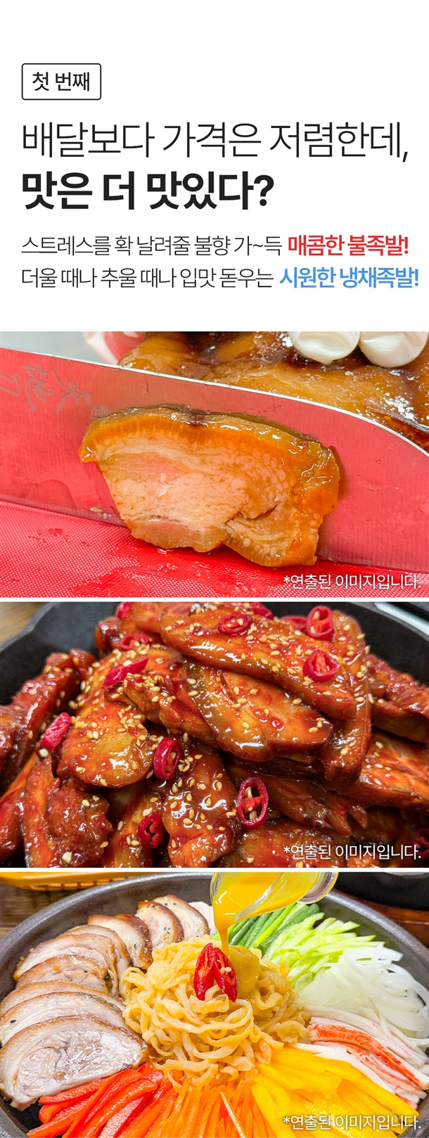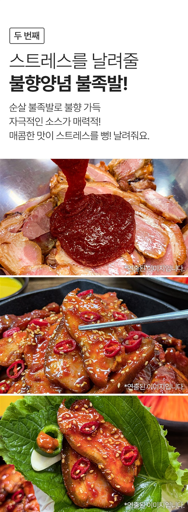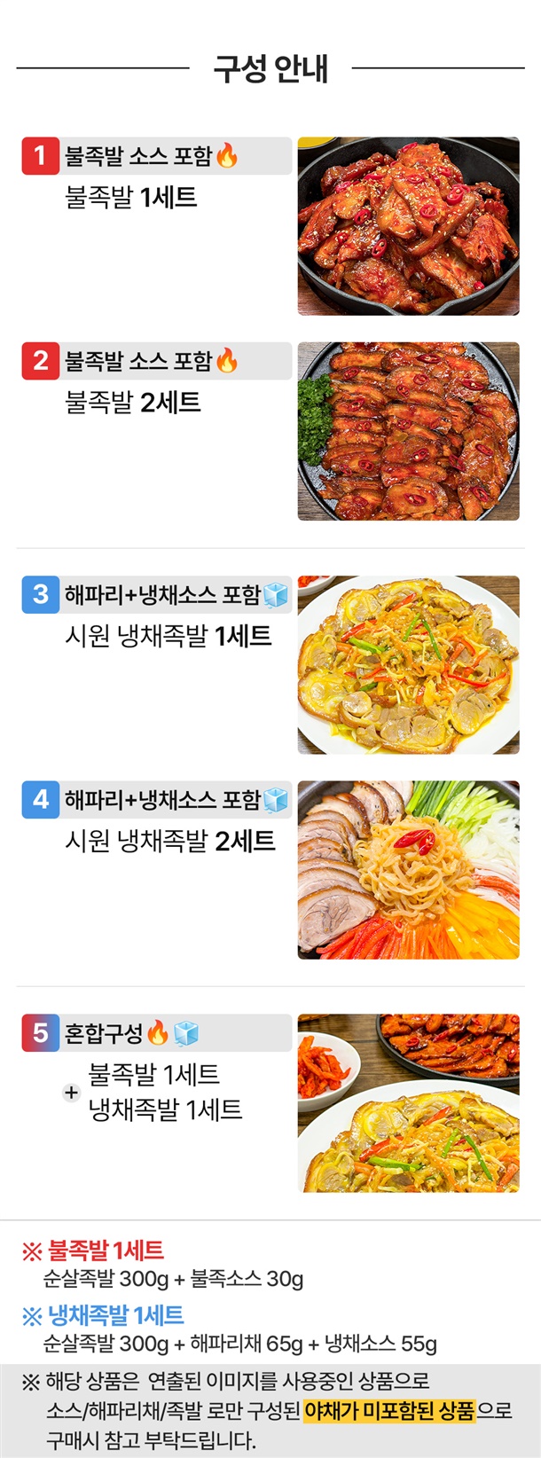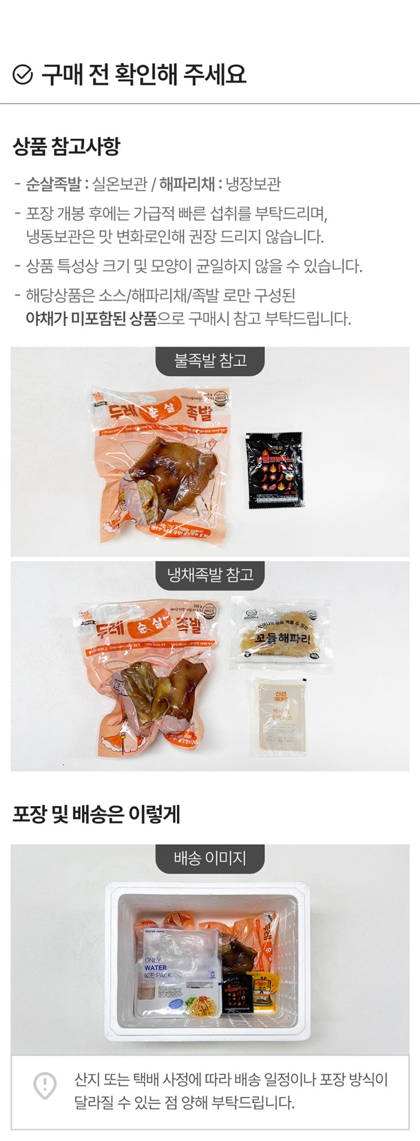 | 상품구성 및 내용량 | 불족발[두레순살족발 300g+날불태워족소스 30g] 1세트, 2세트 / 냉채족발[두레순살족발 300g+꼬들해파리 65g+해파리냉채소스 55g] 1세트, 2세트 / 불족발 1세트+냉채족발 1세트 |