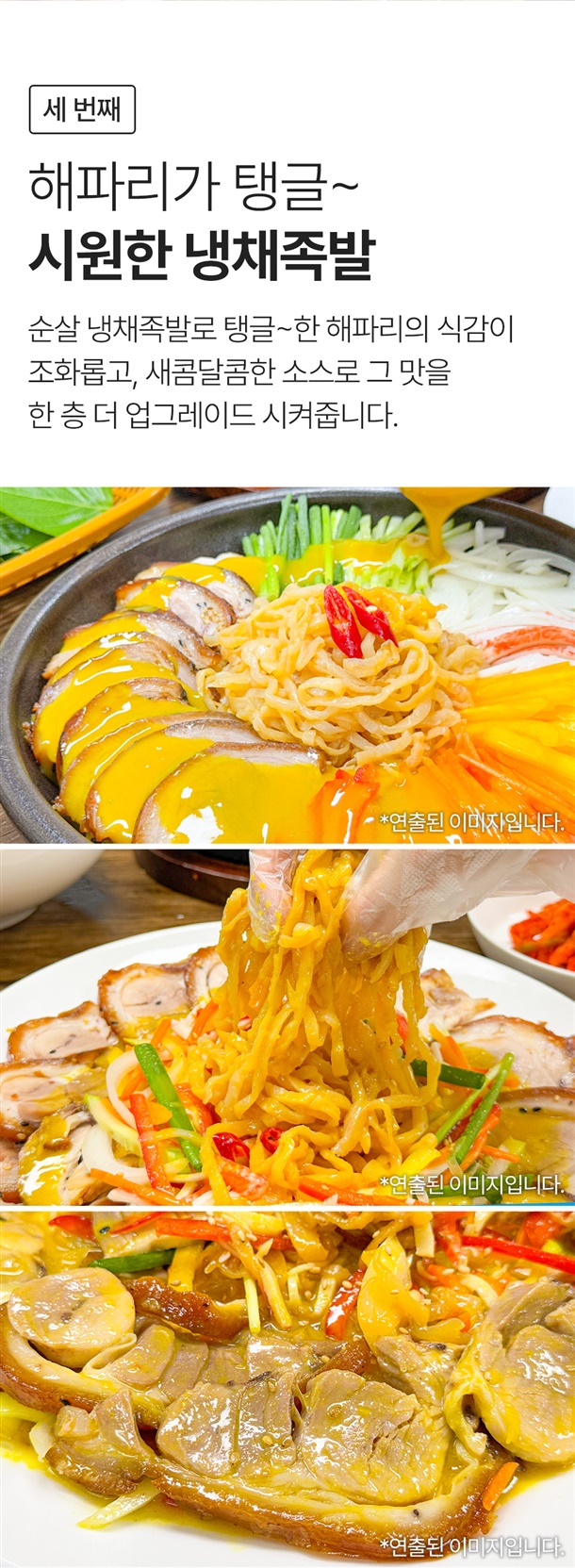 | 제조원 | 두레순살족발 : 두레식품㈜-경기도 화성시 정남면 서봉로851번길 76-13 / 해파리냉채소스 : 푸른식품㈜-인천광역시 강화군 불은면 고능로 300 / 꼬들해파리 : 태양수산-경주시 강동면 수궁서당길 26-6 / 날불태워족소스 : ㈜혜성식품-경기도 수원시 영통구 신원로 250번길 58 |