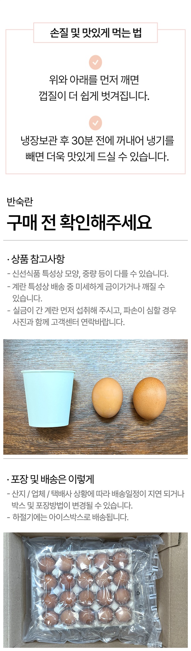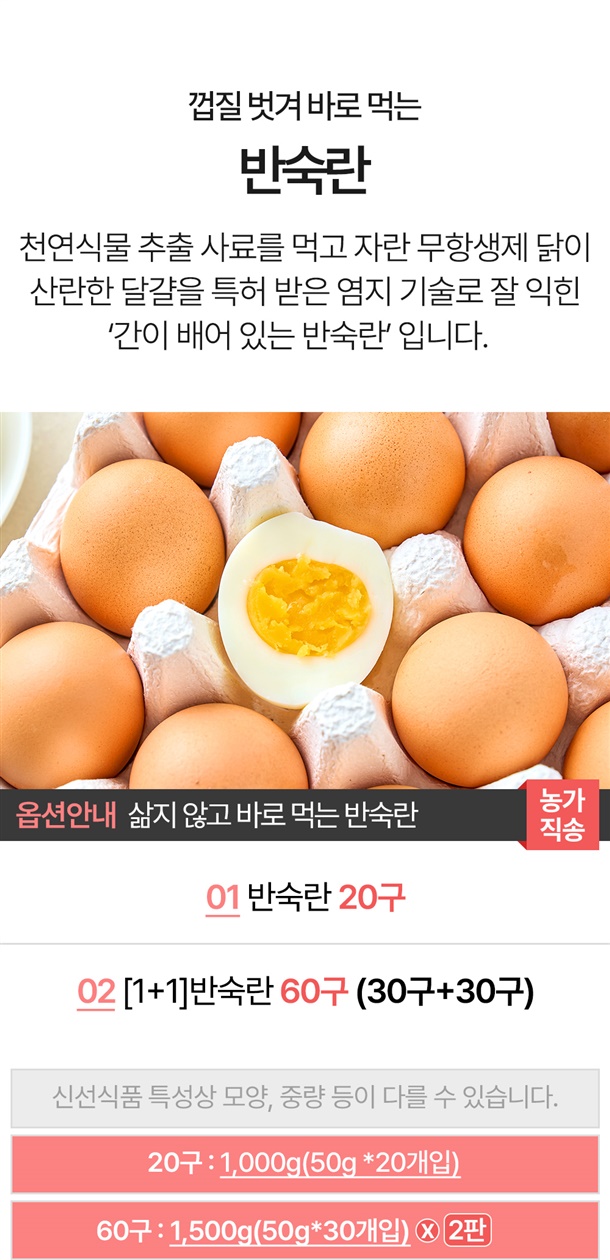 상품구성 및 내용량 반숙란 20구(1,000g 내외) / 반숙란 30구(1,500g 내외)*2판