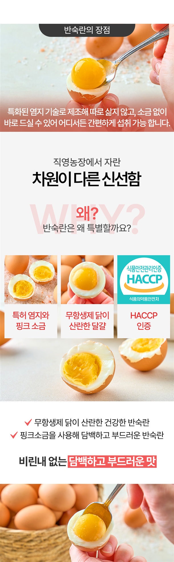 소비자안전을 위한 주의사항 * 반숙란은 수분이 중요하니 맛있게 드시고 남은 반숙란은 깨끗한 밀폐용기에 넣어 냉장 보관해 주십시오. * 간혹 노른자 색이 거무스름해지거나 짙은 녹색을 띠는 경우가 있는데, 이러한 현상은 흰자의 황화수소와 노른자의 철분이 서로 반응하여 생기는 자연현상으로 품질이나 취식에는 문제가 없습니다. * 본 제품은 공정거래위원회 고시 소비자 분쟁해결기준에 의거 교환 또는 환불해드립니다. * 부정·불량식품 신고는 국번없이 1399