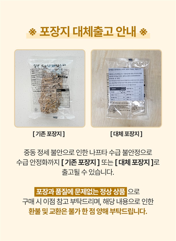 | 식품유형 | ■메밀면 : 생면(주정처리제품) ■메밀소바소스 : 소스(살균제품) ■비빔양념장 : 소스(살균제품) |