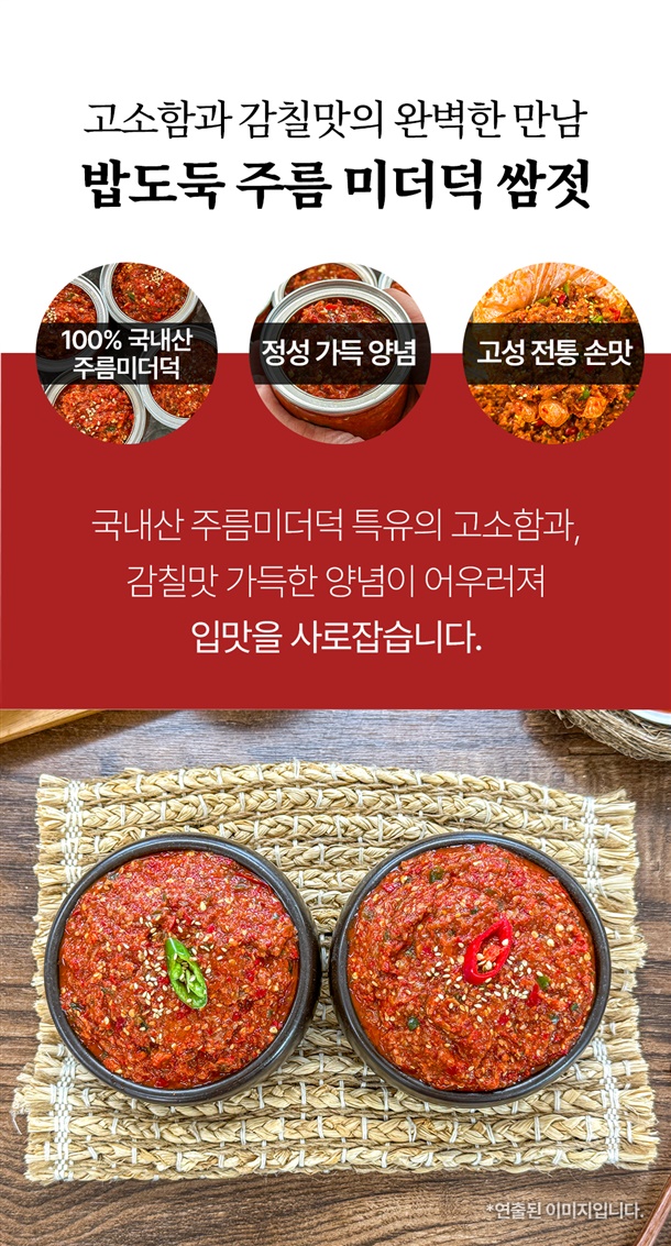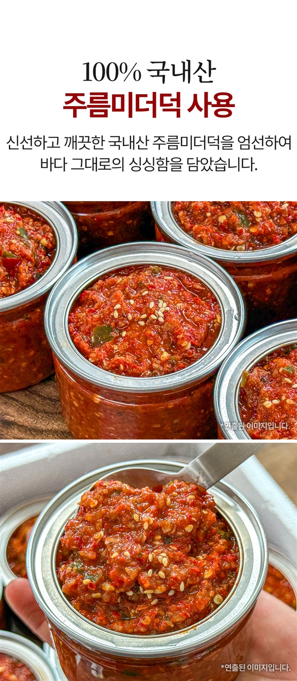 주름미더덕(국내산)70%, 고춧가루(국산40%,중국산60%), 고추장[물엿,소맥분(밀:미국산,호주산)]5%, 혼합간장4%, 복합조미식품, 설탕, 생강가루, 후춧가루, 통깨, 참기름, 조미액젓, 물엿, 간마늘(국산)3.5% *대두, 밀, 쇠고기 함유 |