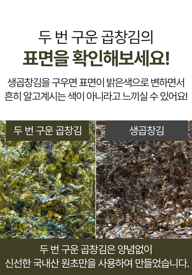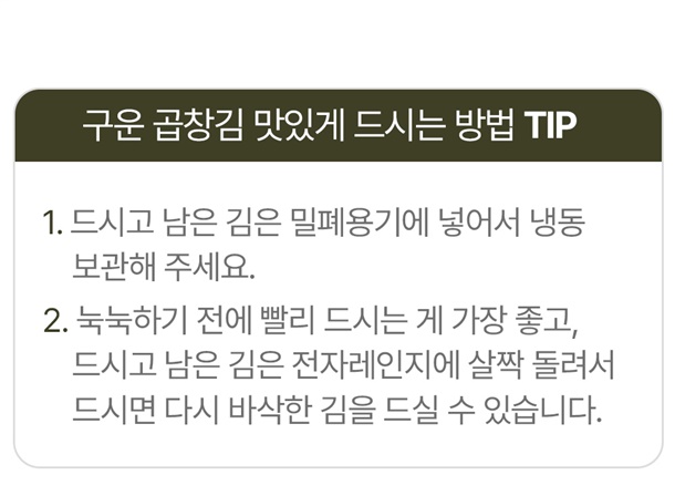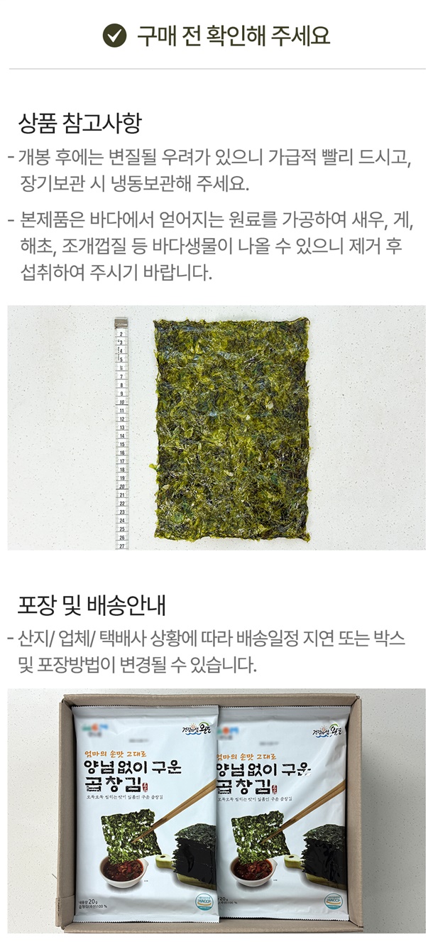 * 본 제품은 공정거래위원회 고시 소비자분쟁해결 기준에 의거 교환 또는 보상 받을 수 있습니다. * 반품 및 교환장소 : 구입처 및 소비자상담실 * 개봉 후에는 변질될 우려가 있으니 가급적 빨리 드십시오. * 부정·불량식품 신고는 국번없이 1399 * 제품 내 방습제는 인체에 무해하나 먹지 마십시오. * 본 제품은 바다에서 얻어지는 원료를 가공하여 새우, 게, 해초, 조개껍질 등 바다생물이 나올 수 있으니 제거 후 섭취하여 주시기 바랍니다.