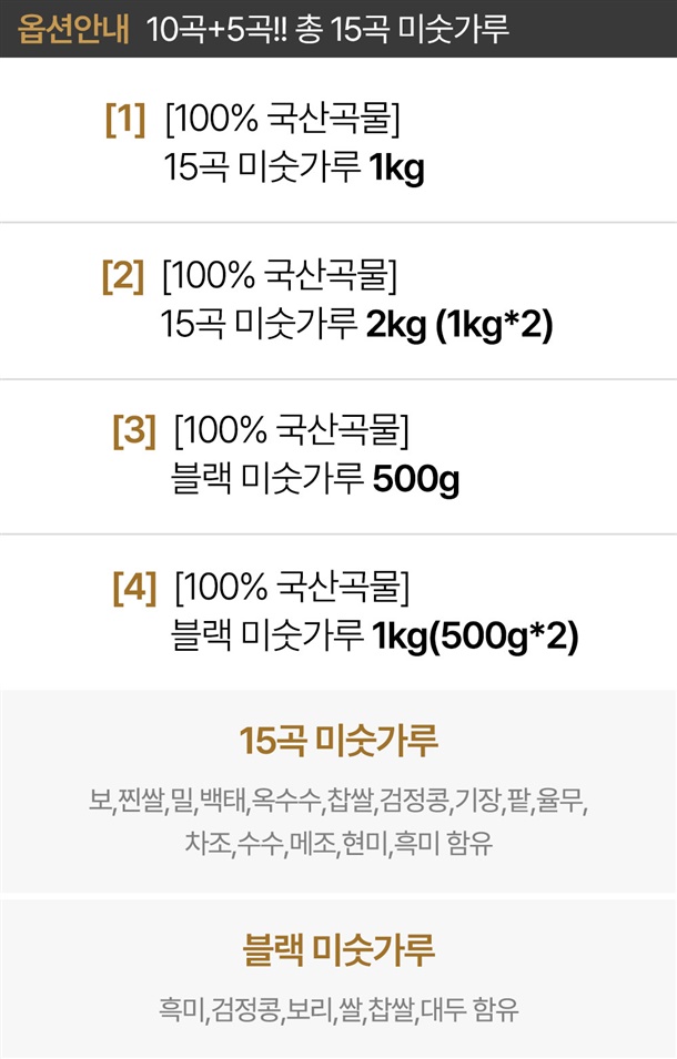 15곡 : 1kg*1개, 1kg*2개 / 블랙 : 500g*1개 , 500g*2개 |