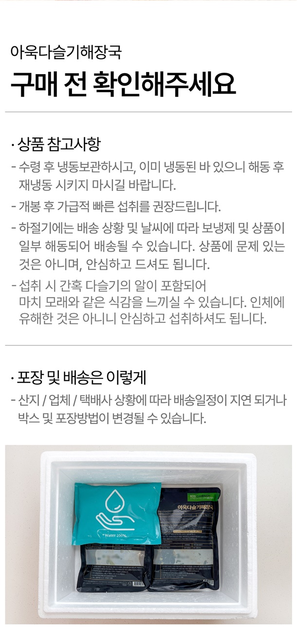 -이 제품은 알레르기 발생 가능성이 있는 메밀, 우유, 토마토, 고등어, 계란, 새우, 땅콩, 호두, 복숭아, 닭고기, 쇠고기, 오징어, 조개류(굴,전복,홍합), 잣을 사용한 제품과 같은 제조시설에서 제조하고 있습니다. / -간혹 패각류 껍질조각이 붙어 있을 수 있으니 주의하여 섭취하십시오. / -이미 냉동된 바 있으니 해동 후 재냉동 시키지 마시길 바랍니다. / -봉지째 전자레인지에 넣어 조리하지 마십시오.