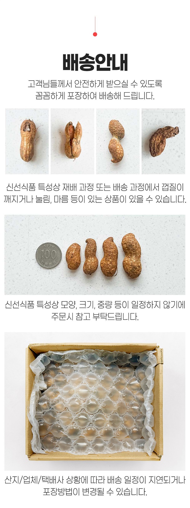 - 배송일은 결제 다음 날부터 평일 기준 2~4일 정도 소요됩니다. 주문 폭주나 산지, 택배 상황에 따라 추가로 지연될 수 잇습니다.
