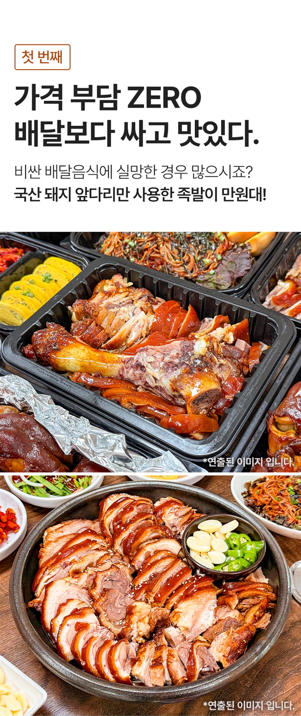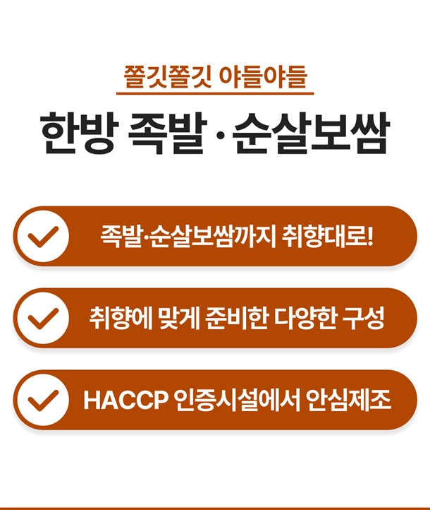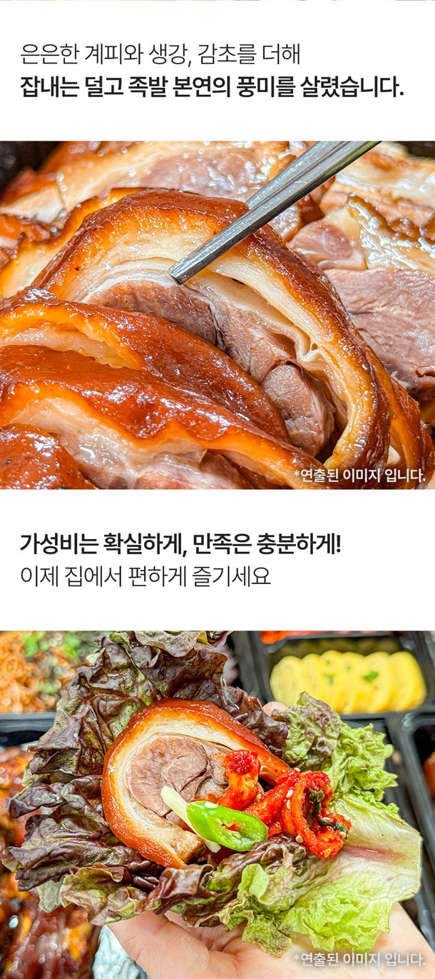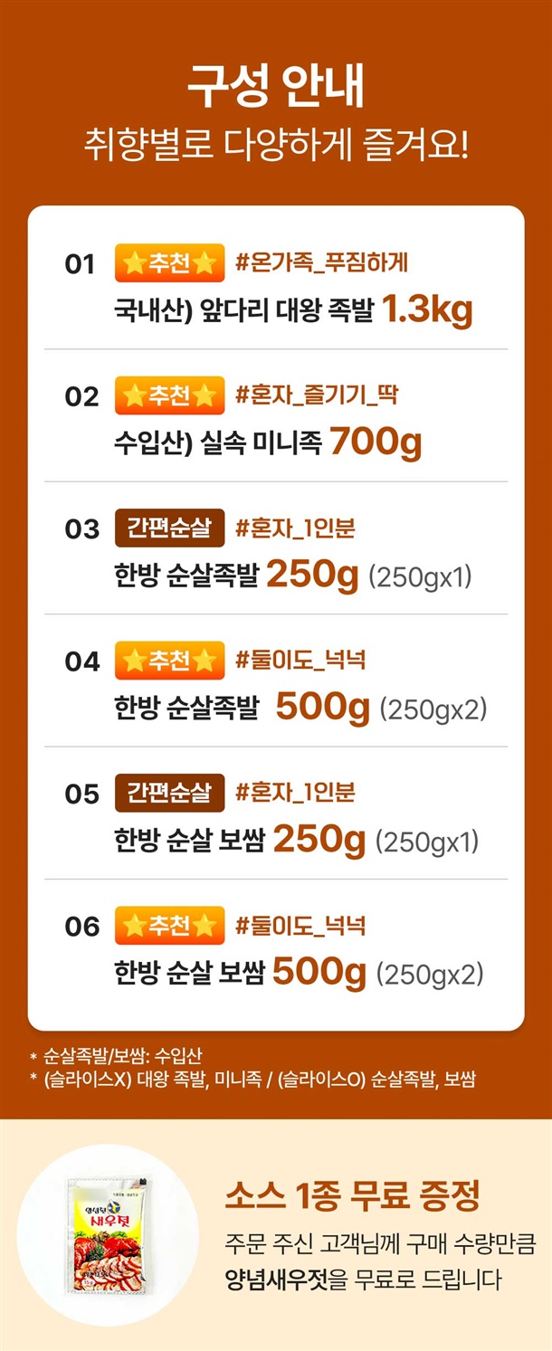 | 1. 상품구성 및 내용량 | 왕족발: 1.3kg내외 / 미니족발: 700g / 순살족발: 250g*1팩, 250g*2팩 / 보쌈: 250g내외*1팩, 250g내외*2팩 |