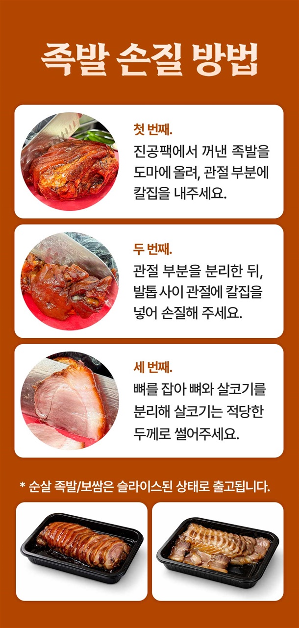 | 1. 보관방법 | 왕족발, 미니족발: 냉장보관(-2~10˚C) / 순살족발, 보쌈: 냉동보관(-18˚C이하) |