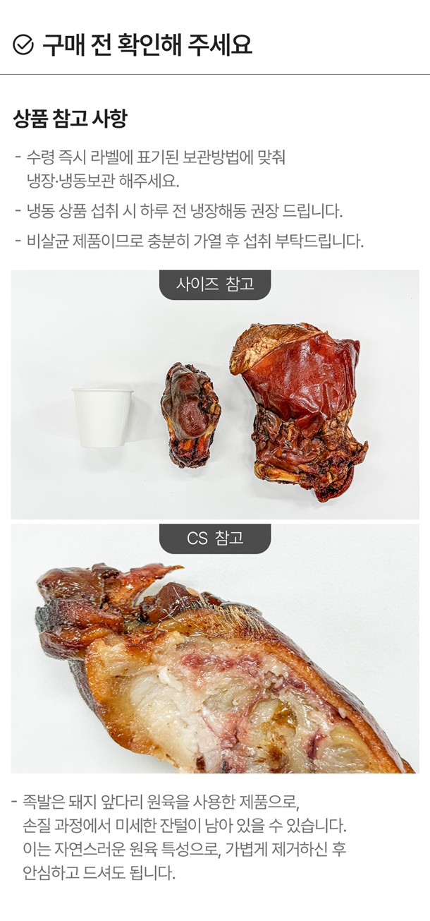 | 1. 소비자안전을 위한 주의사항 | ㆍ비살균 제품이므로 충분히 가열하여 섭취하십시오. / 왕족발, 미니족발: 구매 후 냉장 보관하시고, 개봉 후에는 변질되기 쉬우니 가급적 빨리 드십시오. / 순살족발, 보쌈: 구매 후 냉동 보관하시고, 개봉 후에는 변질되기 쉬우니 가급적 빨리 드십시오. |