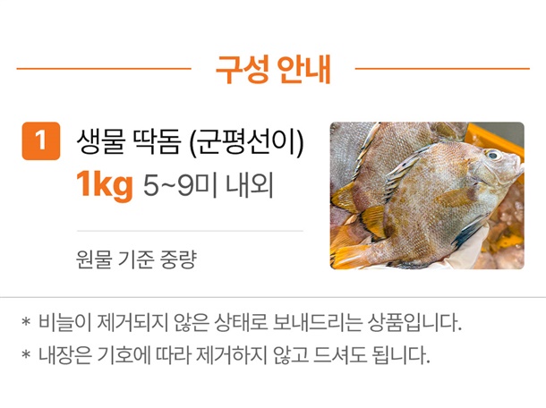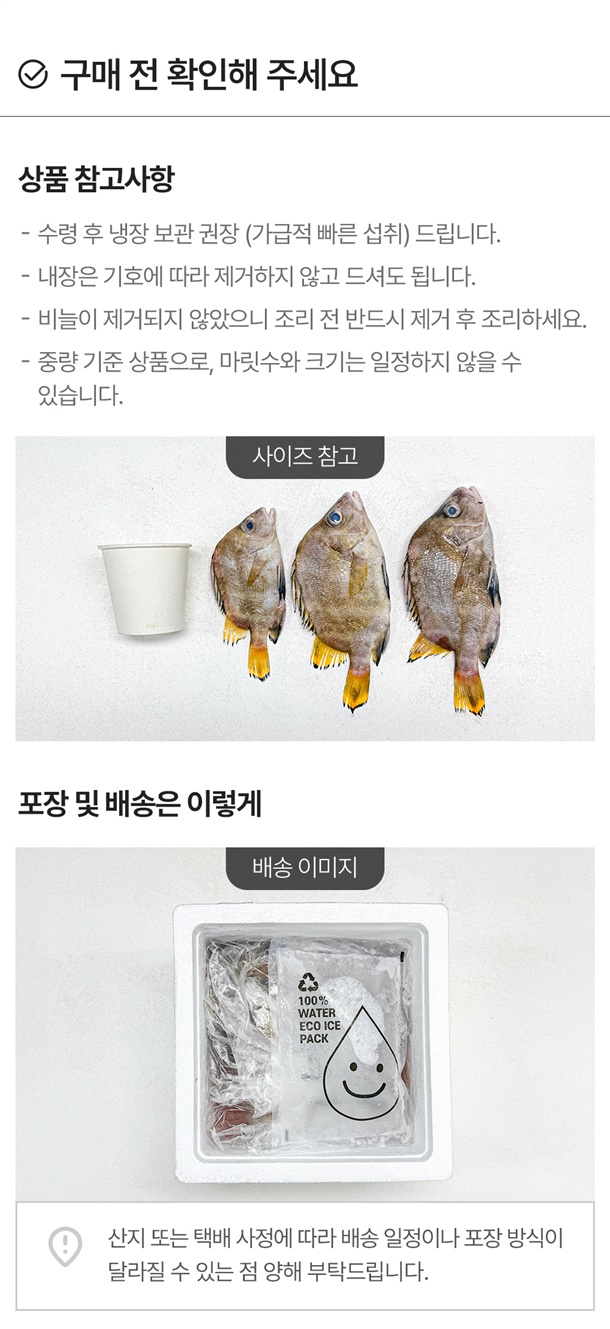 ㆍ내장은 기호에 따라서 제거 하지 않고 드셔도 괜찮습니다. ㆍ비늘이 제거되지 않았으므로 제거하고 드시기 바랍니다. |