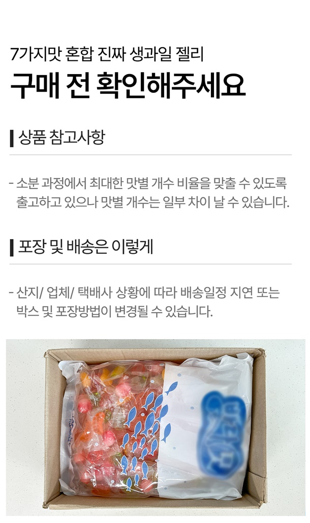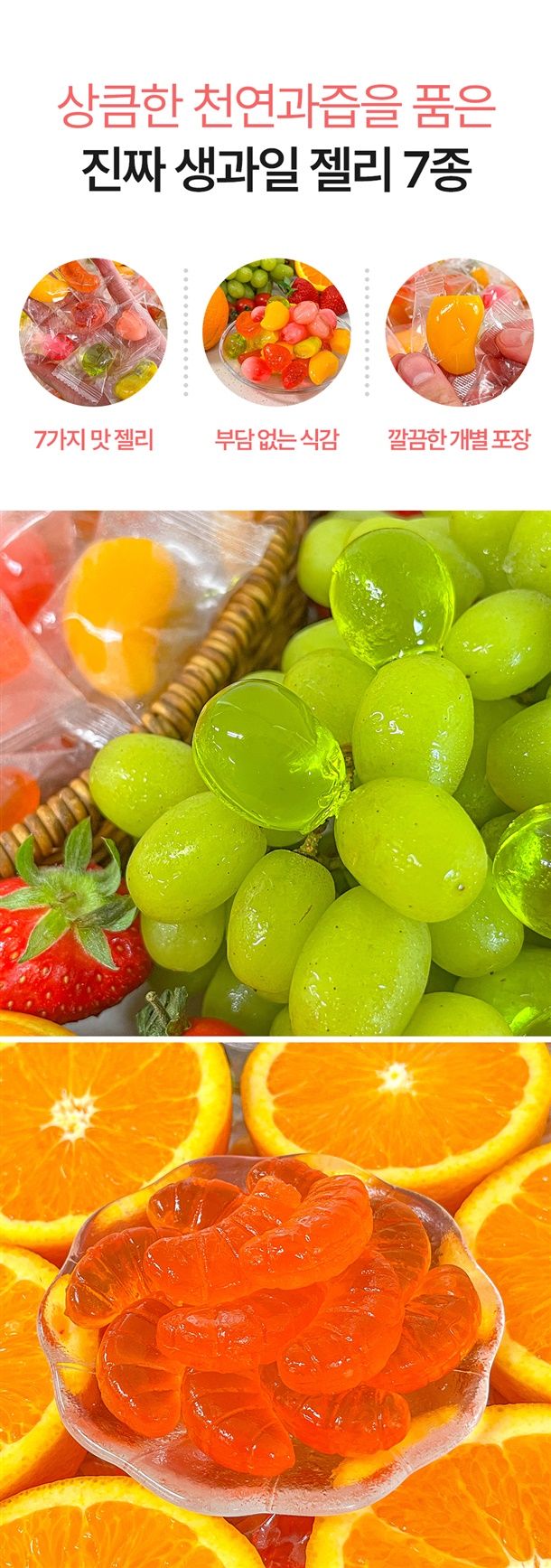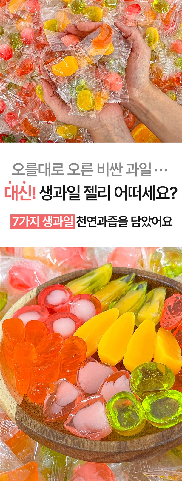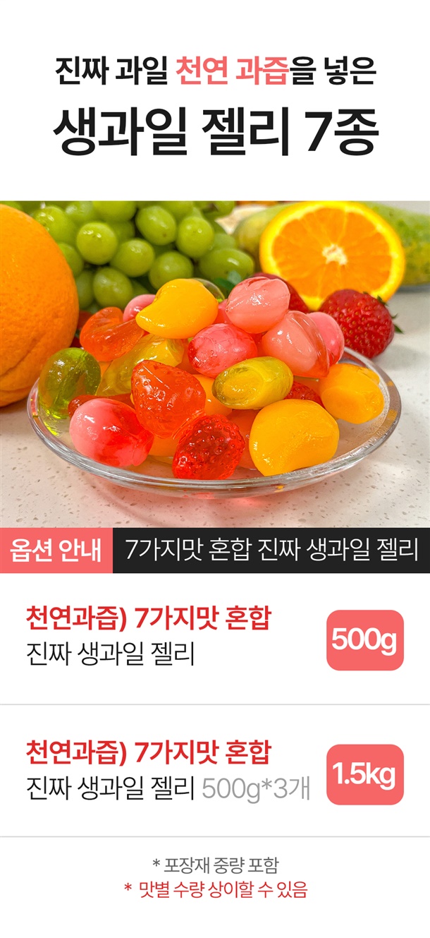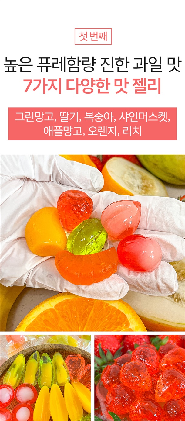 | 품명 | 7가지 과일젤리 혼합(그린망고,딸기,복숭아,샤인머스캣,애플망고,오렌지,리치) |