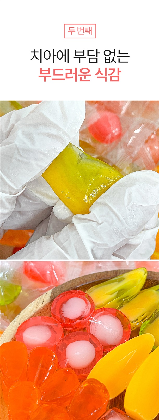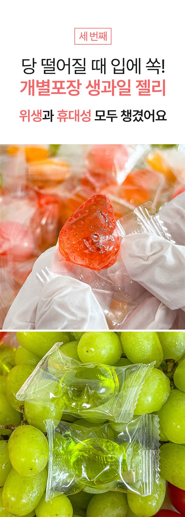 | 원재료명 및 함량 | 그린망고맛젤리-맥아시럽,망고퓨레25%,설탕,정제수,카라기난,구연산,구연산나트륨,합성향료(망고향)0.04%,DL-사과산,D-소비톨,착색료(이산화티타늄,식용색소황색제4호,식용색소황색제5호,식용색소청색제1호) / 딸기맛젤리-맥아시럽,딸기퓨레5%,설탕,정제수,카라기난,대두유,구연산,구연산삼나트륨,천연향료(딸기향)0.04%,DL-사과산,착색료(식용색소황색제4호) / 복숭아맛젤리-맥아시럽,복숭아과육25%,설탕,정제수,카라기난,구연산,구연산나트륨,천연향료(복숭아향)0.04%,DL-사과산,D-소비톨,착색료(이산화티타늄,식용색소 적색40호) / 샤인머스켓맛젤리-맥아시럽,샤인머스켓과육25%,설탕,정제수,카라기난,구연산,구연산나트륨,합성향료(샤인머스켓향)0.04%,DL-사과산,착색료(식용색소청색1호,식용색소황색제4호) / 애플망고맛젤리-맥아시럽,애플망고퓨레25%,설탕,정제수,카라기난,구연산,구연산나트륨,천연향료(애플망고향)0.04%,DL-사과산,D-소비톨,착색료(이산화티타늄,식용색소황색제4호,식용색소황색제5호) / 오렌지맛젤리-맥아시럽,오렌지퓨레25%,설탕,정제수,카라기난,구연산,구연산나트륨,천연향료(오렌지향)0.04%,DL-사과산,착색료(식용색소황색제5호,식용색소황색제4호) / 리치맛젤리-맥아시럽,리치과육25%,설탕,정제수,카라기난,합성향료(리치향)0.04%,D-소비톨,착색료(이산화티타늄,식용색소적색제40호) |