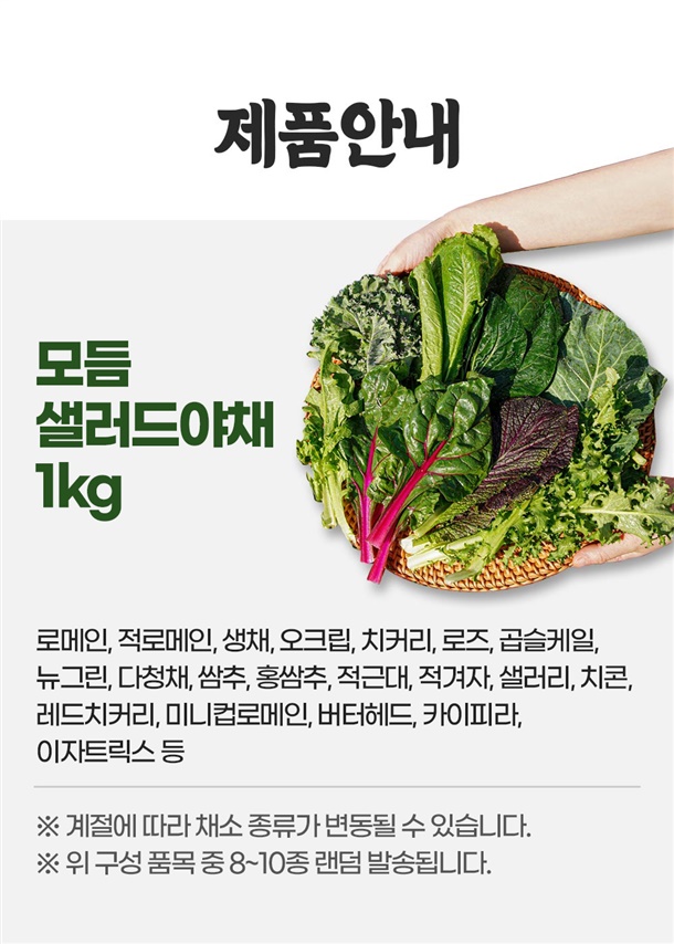 1kg (로메인, 적로메인, 생채, 오크립, 치커리, 로즈, 곱슬케일, 뉴그린, 다청채, 쌈추, 홍쌈추, 적근대, 적겨자, 샐러리, 치콘, 레드치커리, 미니컵로메인, 버터헤드, 카이피라, 이자트릭스 + 등) *계절에 따라 채소 종류가 변동될수 있습니다. |