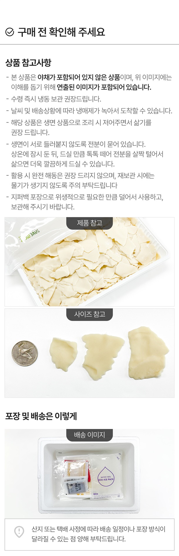| 1.소비자안전을 위한 주의사항 | 개봉 후 남은 제품은 밀봉하여 냉동보관하시고 가급적 빠른 기간내에 드십시오. 해동 후 보관방법 재냉동 하지 마시길 바랍니다.. 제품 개봉 시 냄새가 날 수도 있으나 이는 발효주정 냄새로서 조리과정에서 자연소멸되오니 안심하고 드십시오./본 제품은 메밀, 보리, 대두를 사용한 제품과 같은 생산시설에서 제조하고 있습니다 |
