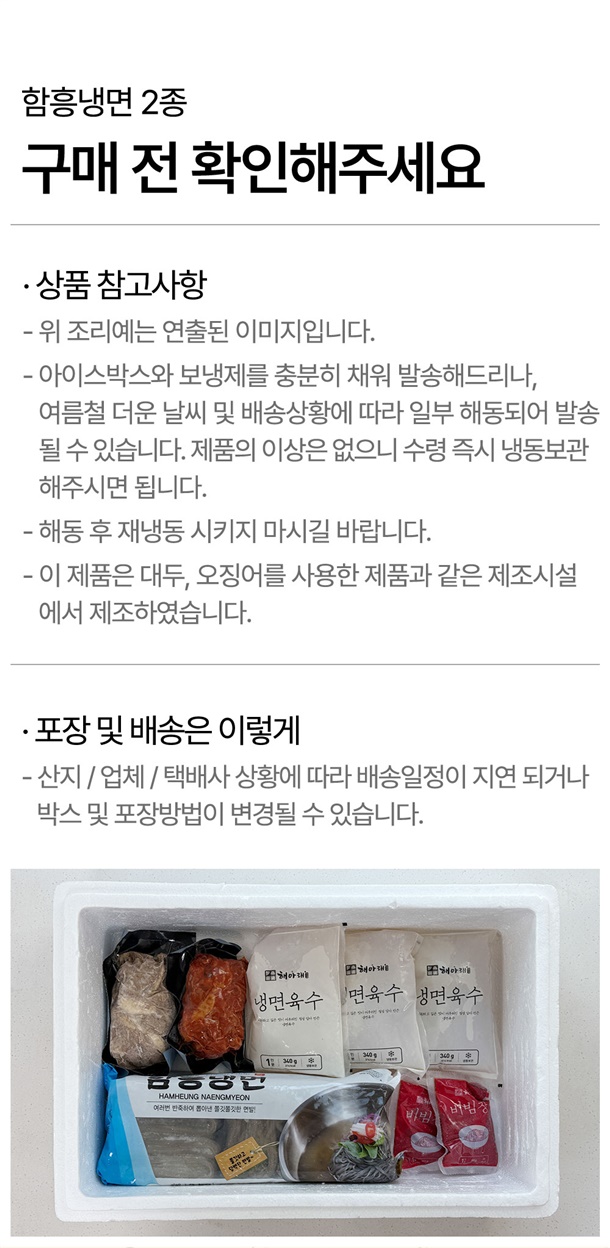 | 1. 소비자안전을 위한 주의사항 | 이제품은 메밀,대두를 사용한 제품과 같은 제조시설에서 제조하였습니다. / 이미 냉동된 바 있으니 해동 후 재 냉동시키지 마시길 바랍니다. / 본재품은 공정거래 위원회 고시 소비자 분쟁해결 기준에 의거 교환 또는 보상 받을 수 있습니다. |