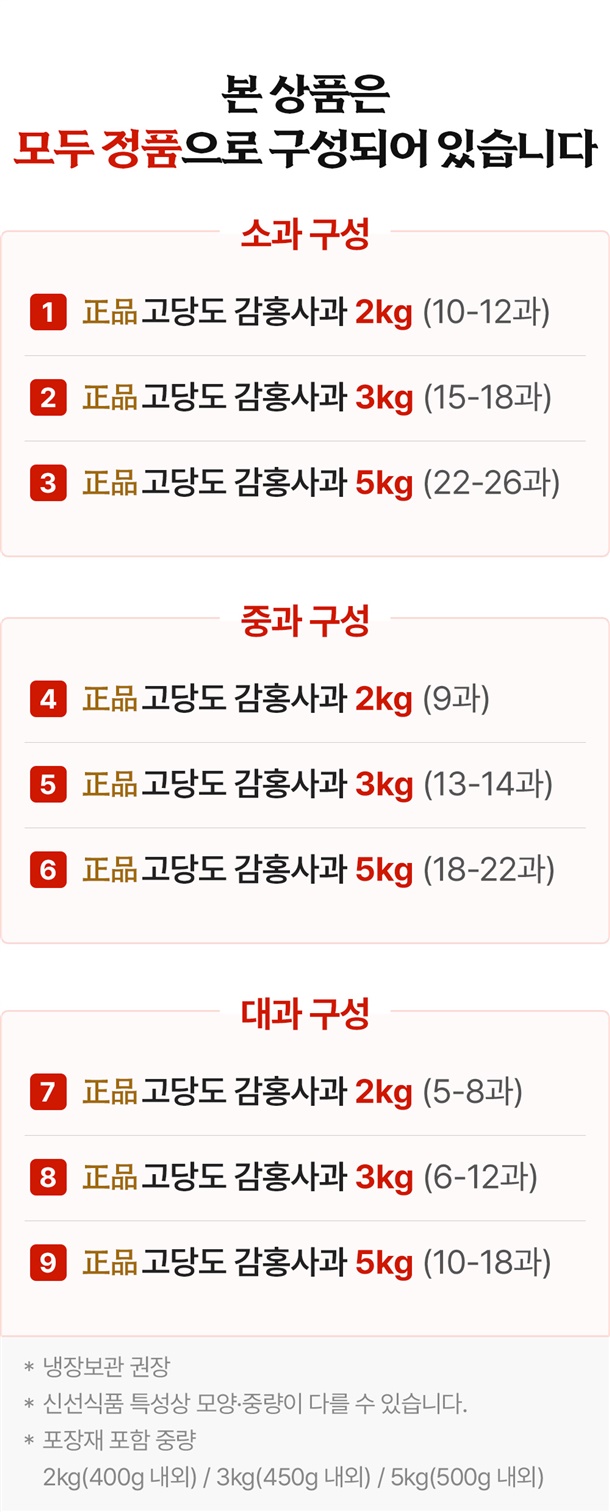 (소과/중과/대과) 2kg, 3kg, 5kg (*각 포장재 400g, 450g, 500g 내외 포함 중량) |