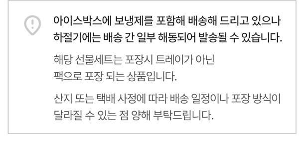 출고되는 상품 송장의 발송인은 '농가살리기/와이플로우'로 표기되며, 선물 받으시는 분들께 미리 연락해 주시거나, [배송시 요청사항]에 주문자분 성함을 기재해주시기 바랍니다.※ 위 사항으로 반송될 경우 교환 및 환불이 불가합니다.