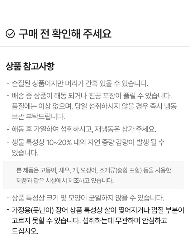ㆍ해동 후 충분히 가열 후 섭취하시기 바랍니다. ㆍ이미 냉동된 바 있으니 재냉동 시키지 마십시오. ㆍ본 제품은 고등어, 새우, 게, 오징어, 조개류(홍합 포함) 등을 사용한 제품과 같은 시설에서 제조하고 있습니다. |
