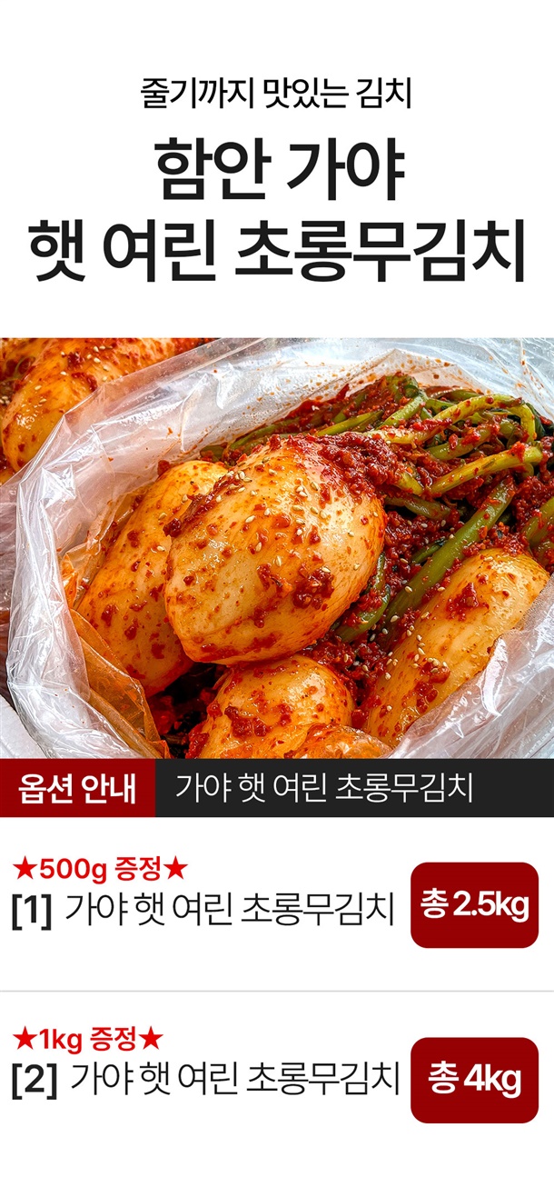 초롱무(국산)75%,고춧가루(국산)5%,마늘(국산)4%,양파(국산)2%,천일염(국산)4%,설탕2%,새우젓4%,해물육수4% |