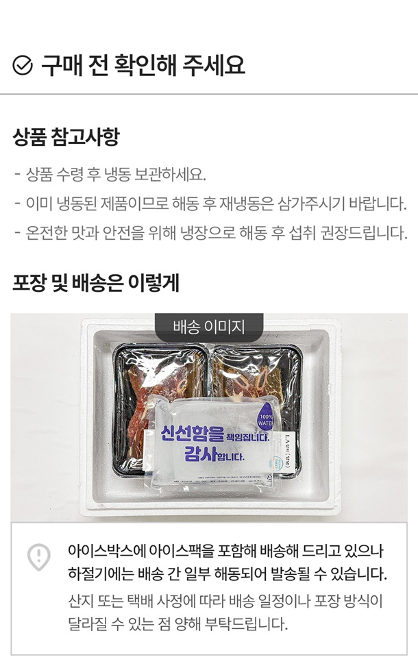 ㆍ냉동보관 하시기 바랍니다. ㆍ냉장에서 해동 후 완전히 익혀 드시는 것을 권장 드립니다. ㆍ이미 냉동된 바 있으니 해동 후 재냉동 시키지 마십시오. ㆍ보관방법이 지켜지지 않거나 포장이 훼손된 경우에는 유통기한 이내라도 변질될 수 있습니다. ㆍ조리 시 뜨거운 증기나 기름에 화상을 입을 수 있으니 주의하시기 바랍니다.