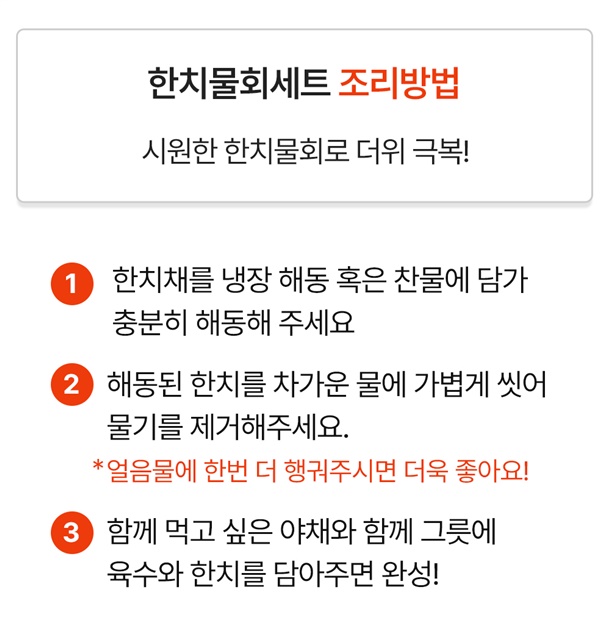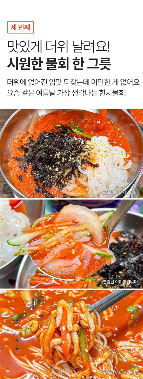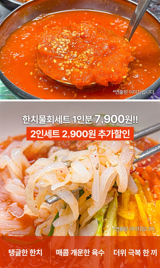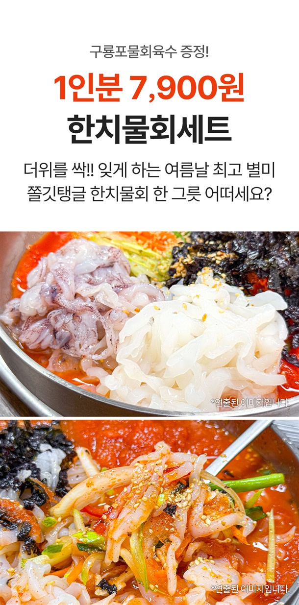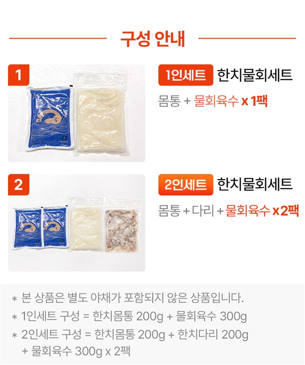 ㆍ1인세트 : 냉동화살꼴뚜기(동체,포장횟감) 200g + 물회육수 300g*1팩 ㆍ2인세트 : 냉동화살꼴뚜기(동체,포장횟감) 200g + 냉동화살꼴뚜기(다리,포장횟감) 200g + 물회육수 300g*2팩 |