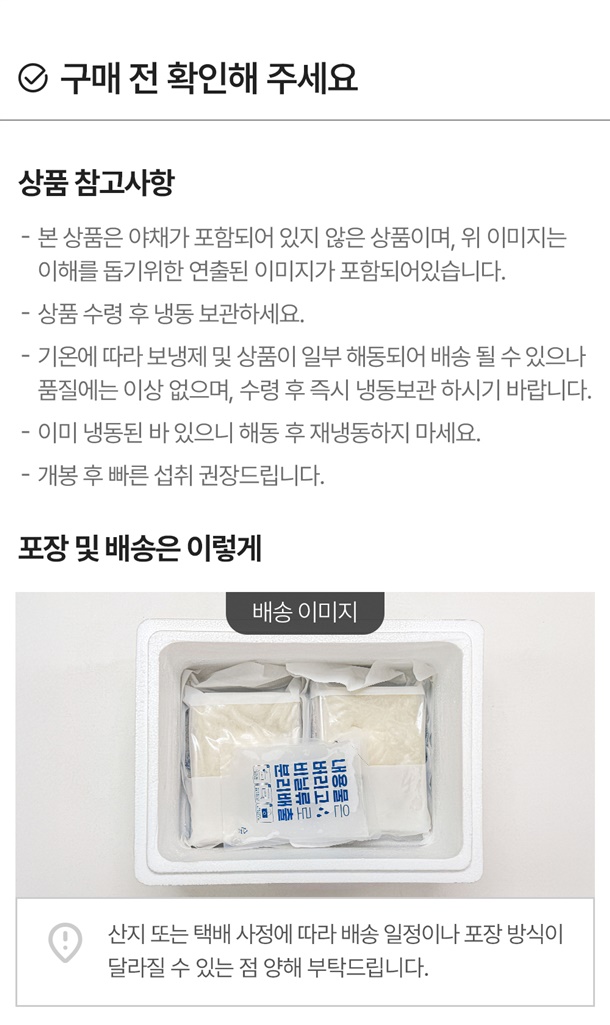 냉동화살꼴뚜기(동체,포장횟감), 냉동화살꼴뚜기(다리,포장횟감) : (제품 별도 표기) 출고일 기준 12개월 이내 생산 상품 / 물회육수 : 출고일 기준 12개월 이내 생산 상품 |