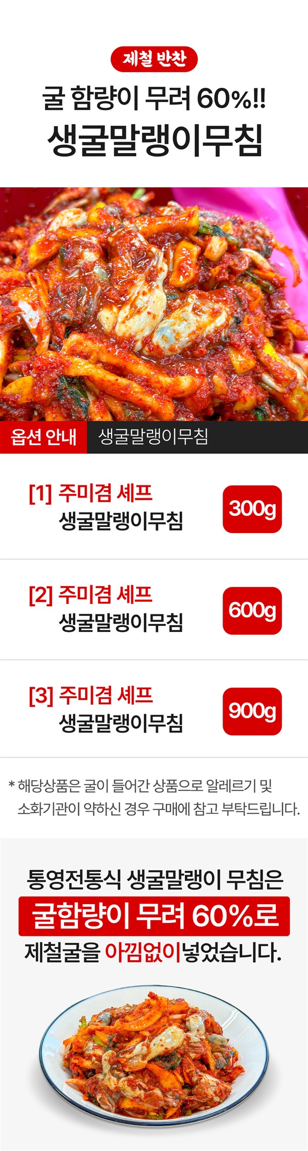 굴[통영(국내산)]60%,무(국내산)20%,고춧가루[국내산,중국산(해썹)]5%,백설탕3%,사과3%,새우(베트남산)2%,양파(국내산)2%,마늘(국산)1%, 생강(국내산)1%, 액젓(국내산)1%,당근(국내산,수입산)1%,간장1% |