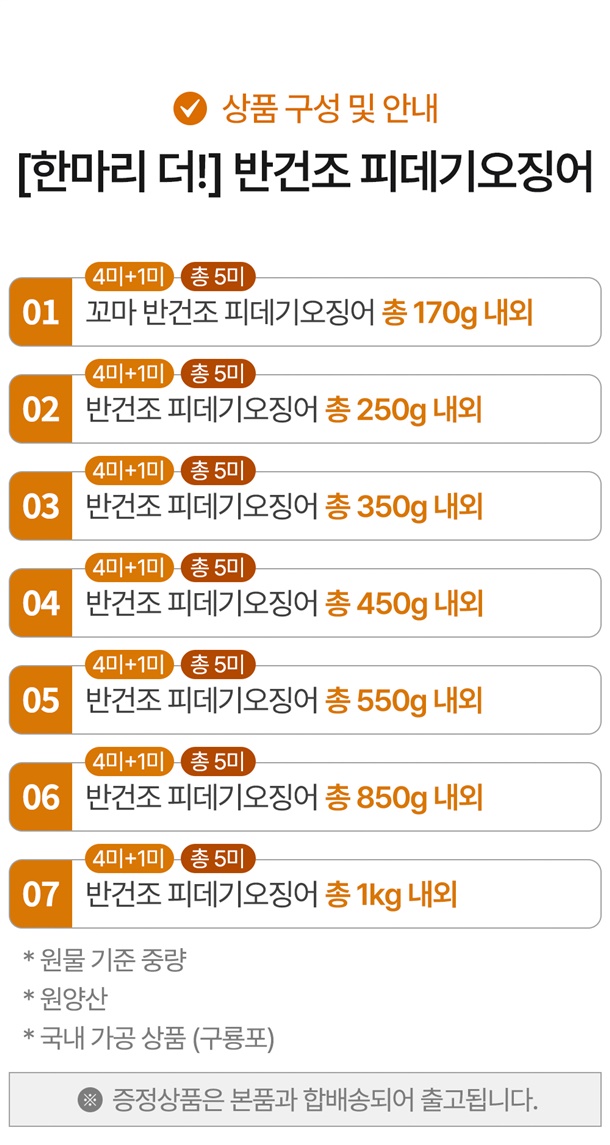 170g 내외(꼬마) / 250g 내외 / 350g 내외 / 450g 내외 / 550g 내외 / 850g 내외 / 1kg내외 |