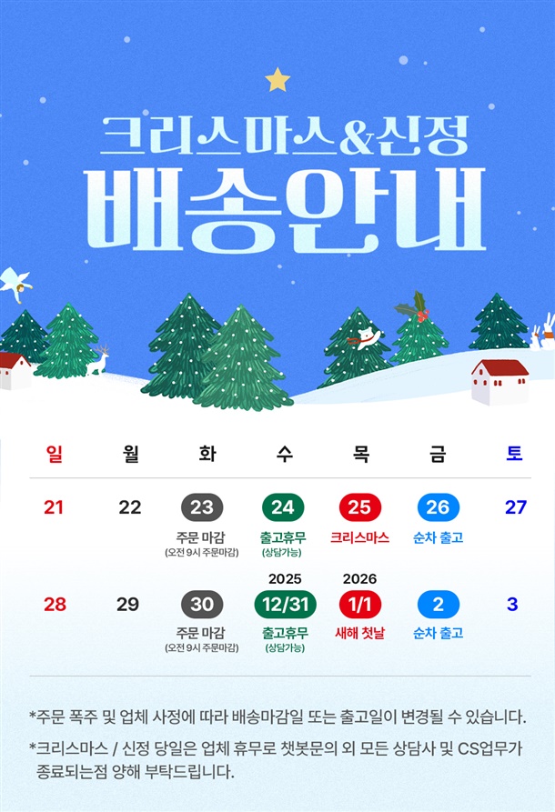 - 배송일은 결제 다음 날부터 평일 기준 2~4일 정도 소요됩니다. 주문 폭주나 산지, 택배 상황에 따라 추가로 지연될 수 잇습니다.