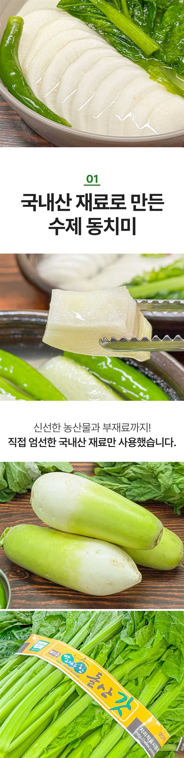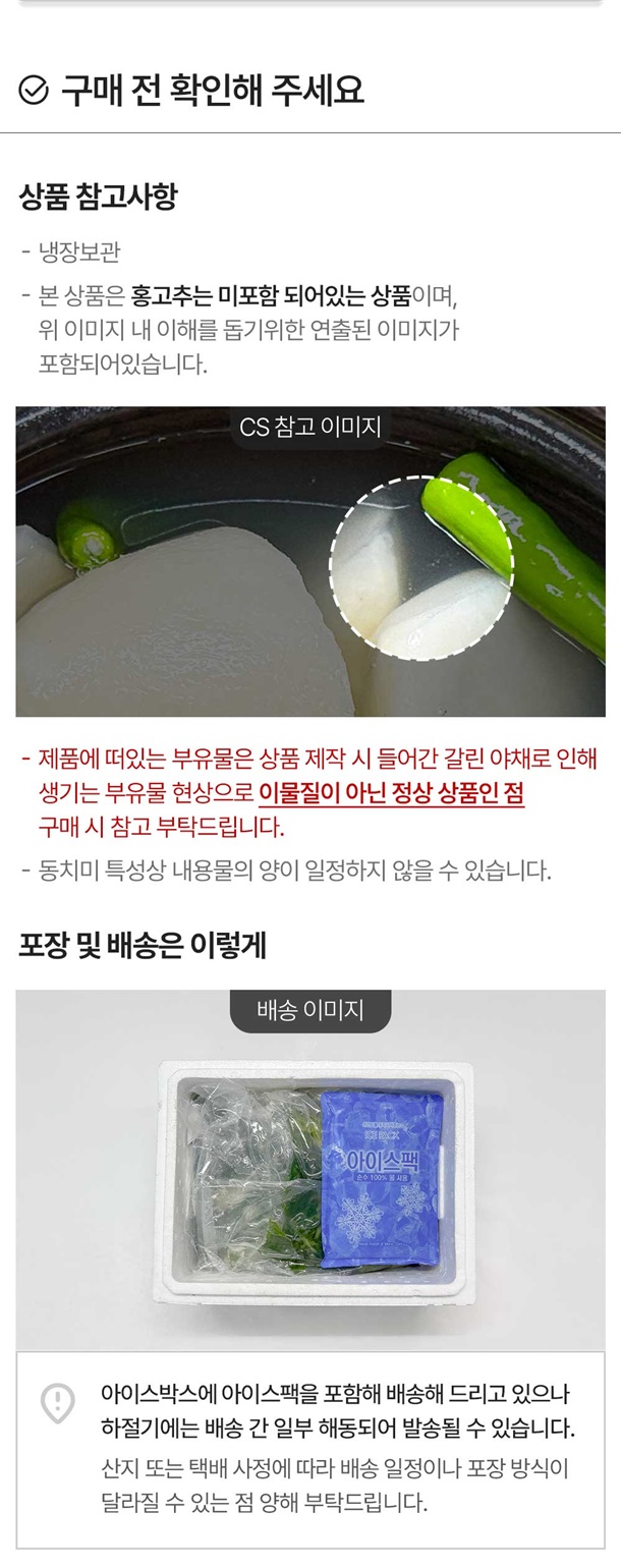 동치미: 절임무40%(무95%:국내산,식염5%:국내산), 정제수50%, 무4%(국내산), 고추(국내산), 마늘(국내산), 배(국내산), 대파(국내산), 다시마, 생강(국내산), 양파(국내산), 설탕 / 돌산 갓동치미: 절임무40%(무95%:국내산,식염5%:국내산), 절임갓3%(갓95%:국내산,식염5%:국내산), 정제수47%, 무(국내산), 고추(국내산), 마늘(국내산), 배(국내산), 대파(국내산), 다시마, 생강(국내산), 양파(국내산), 설탕 |