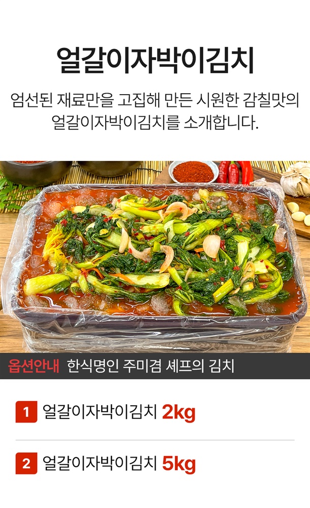 얼갈이(국내산)70%,꽃게육수(국내산)5%,고추가루(국내산40%,중국산(해썹)60%)5%,새우(베트남산)2%,마늘(국내산)1%,생강(국내산)1%,양파(국내산)2%,액젓(국내산)1%,과당3%,사과4%,당근(국내산40%,중국산60%)1%,무(국내산)3%,청양고추(국내산)1%,천일염(호주산)1% |