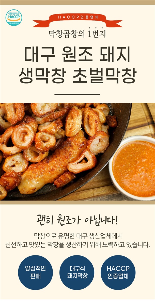 | 제조원 | 돼지막창,꾸븐돼지막창,돼지불막창 - 주식회사 대건에프앤씨, 대구 달성군 다사읍 세천북로14길 54-10 / 막창소스 - (주)에스팩토리, 경상북도 경산시 압량읍 압독1로 124(1,2층) |
