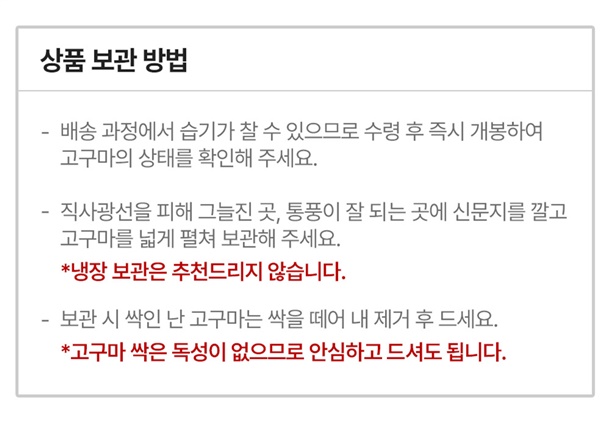 - 배송일은 결제 다음 날부터 평일 기준 2~4일 정도 소요됩니다. 주문 폭주나 산지, 택배 상황에 따라 추가로 지연될 수 잇습니다.