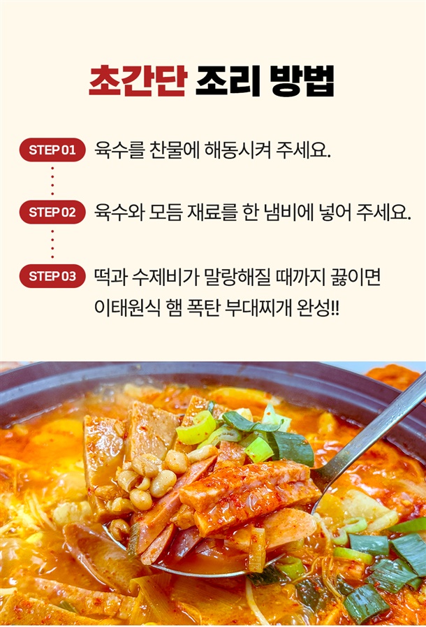 | 소비기한 | 이태원 부대찌개 : 제품 별도표기 / 제조일로부터 12개월까지 부대찌개 모듬햄 : 제품 별도표기 / (냉동보관)제조일 기준 12개월까지 |