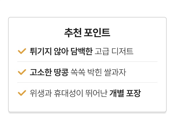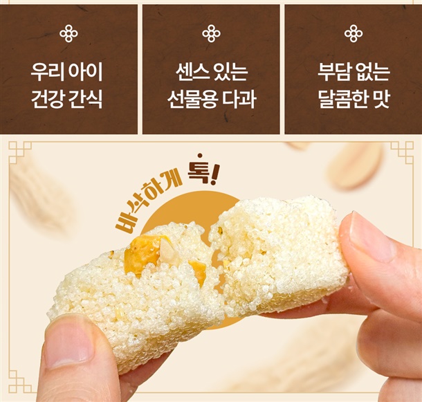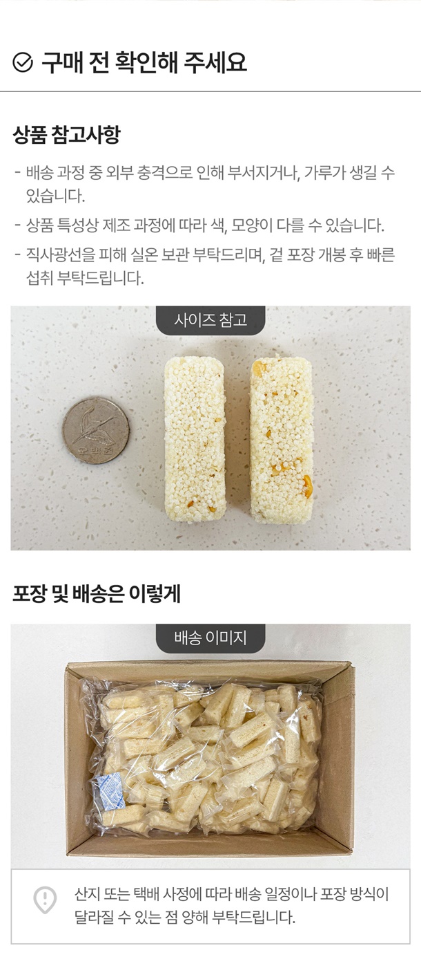 ·알레르기 유발물질 땅콩 함유 ·바깥 포장 개봉 후 최대한 빨리 섭취하십시오. ·쌀과자가 남아있는 경우 꼭 밀봉하여 보관하십시오. ·당류함량이 낮아 가루가 생길 수 있습니다. |